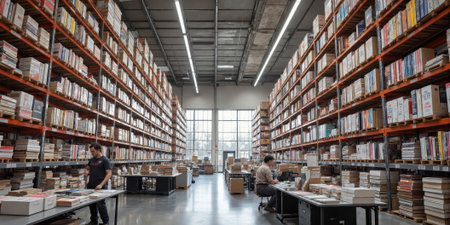 Book Publishing Warehouse A vast distribution center for a major publishing house with towering shelves of books organized by release