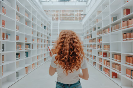 Young woman with curly red hair reading a book in a bright modern library with white shelves filled with books, surrounded by a peaceful atmosphere and soft natural light.