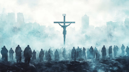 Devotees gather in prayer beneath the crucifixion of Jesus, a city shrouded in fog looms behind them, all depicted in soft, muted colors that evoke deep emotion.