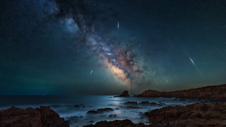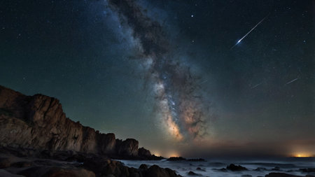 Bright meteors streaking across a stunning night sky filled with countless stars create a magical scene above a tranquil ocean, framed by rugged rocky cliffs in the background