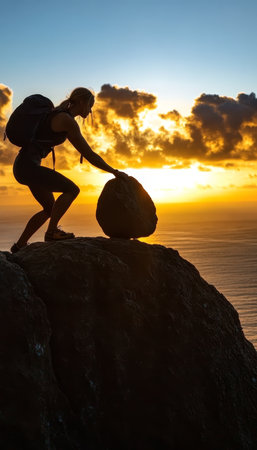 A powerful silhouette of a climber stands atop a rocky mountain during sunrise, capturing the essence of adventure and the breathtaking beauty of nature.