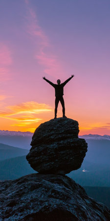 Person in silhouette stands victorious on mountain summit during colorful sunset