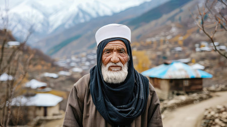 Portrait of an old man, an indigenous resident of a mountain village in national clothes, personifying the national image of a mountain man