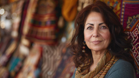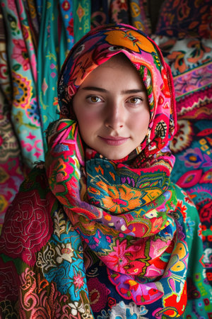 Woman with colorful headscarf, fabric piles, bright, joyful portrait.