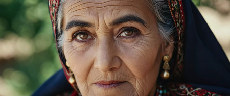 A mature Tajik woman 75 years old, gazes directly showcasing intricate traditional attire, rich cultural heritage of her nationality, evoking wisdom and grace. Brunette woman, wearing a headscarf. AI