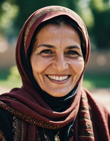 A joyful woman 45 years old from Afghanistan displays a bright smile while wearing traditional clothing. She stands confidently, embodying a sense of peace in her rural community. Generative AI.