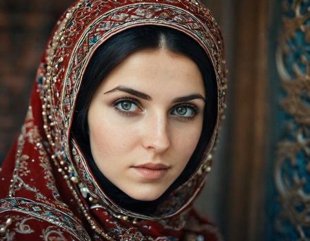 In a stunning display of cultural identity, a Chechen woman wears an ornate traditional costume and scarf, embodying grace and elegance.