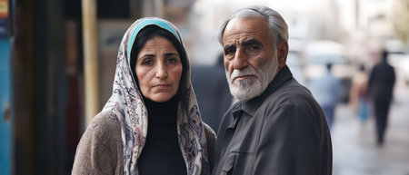 Elderly couple stands closely together on a busy street filled with people. They appear thoughtful and engaged in their surroundings.