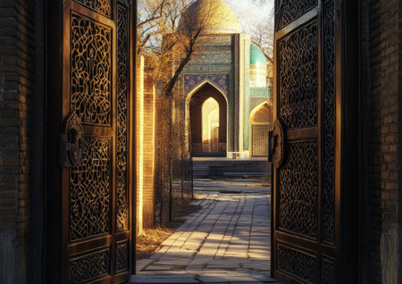 Photo of Samarkand's Gur-e-Amir mausoleum in beautiful evening light, the majestic open gate with intricate patterns leads to an ancient mosque with green domes and a rectangular courtyard, surrounded by historical buildings. The architecture is a blend of imperial style with Arabic influences, featuring arched doorways and decorative ceramic tiles on walls. In the soft golden sunlight, it creates a magical atmosphere, highlighting its rich history and architectural beauty. --ar 7:5 --v 6.1 Job ID: ecb2e427-d9af-4e23-bd73-7cca68ca0848