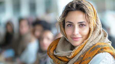 A joyful woman from Afghanistan smiles warmly, displaying a sense of resilience. Her colorful scarf reflects cultural heritage as she sits in her inviting home environment. Generative AI.
