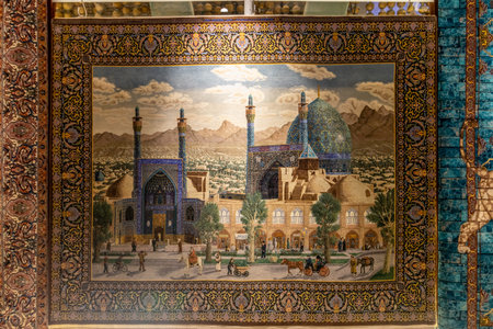 A traditional Persian mosaic wall adorned with intricate geometric and floral patterns in a mix of vibrant hues including sapphire blue, turquoise, and gold. The historical and artistic significance are beautifully showcased.
