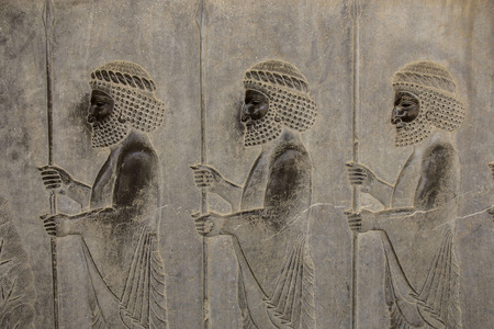 Bas-relief depicts guards - warriors of king. Ancient relief on the wall of the ruined city of Persepolis. Iran.