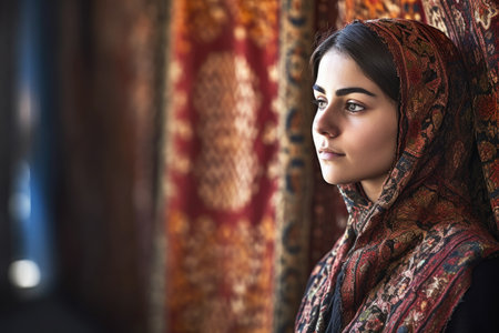 a woman wearing a red and gold head scarf, with her hands on her hipsers chest she is looking into the. Generative Ai