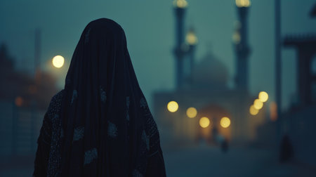 A Muslim woman in a niqab walking towards a big mosque, her figure silhouetted against the evening lights, back view