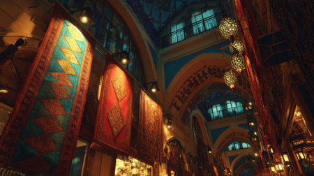 Explore a stunning marketplace adorned with colorful handcrafted rugs and illuminated by exquisite lighting, showcasing ornate architectural details.