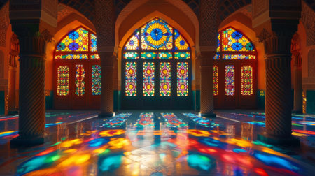 moroccan interior design features tall arched doorways and stained glass windows, creating a magical play of light and shadow as sunlight filters through
