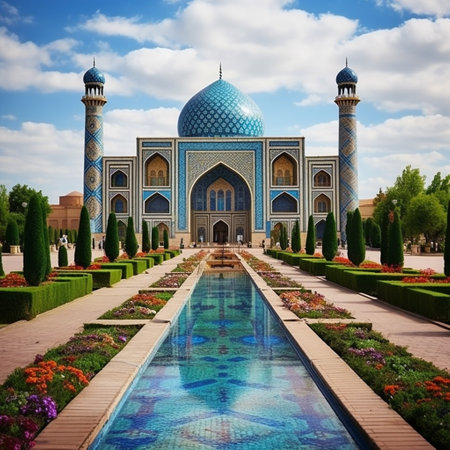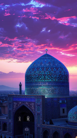 Iconic view of central Asia mosque at sunset, inspired by isphahan culture. Beautiful Islamic architecture. Travel, culture and education concept