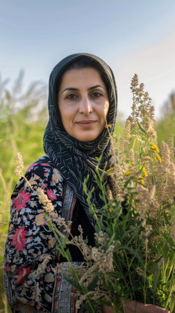 A woman wearing a headscarf stands in a field of tall grass. She is wearing a floral patterned shirt. She is looking at the camera and smiling. The grass is tall and green, and the sky is blue and clear.