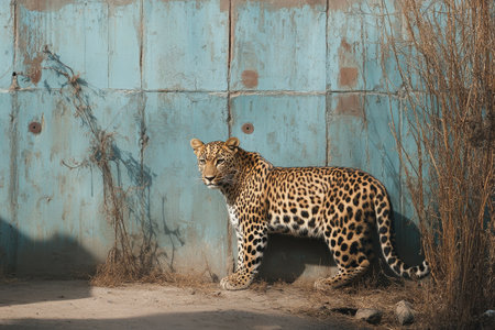 A leopard walks elegantly along a textured wall in a wildlife sanctuary, showcasing its beautiful spotted fur while surrounded by sparse vegetation under bright sunlight.