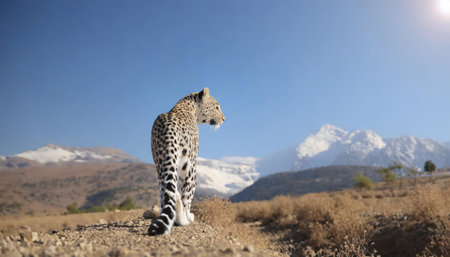 A majestic leopard lounges on a sand dune amidst a desert landscape, displaying its beauty and power Use for wildlife and travel content.