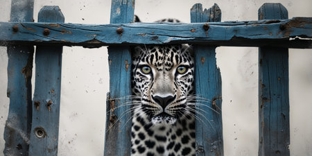 AI Generated. Intense Leopard Peering Through Blue Wooden Fence