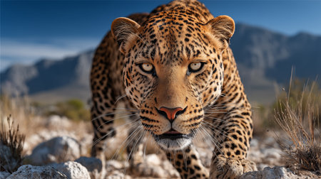 A stunning image of a leopard walking towards the viewer, showcasing its intricate fur patterns and expressive features. Ideal for wildlife enthusiasts.