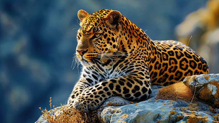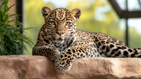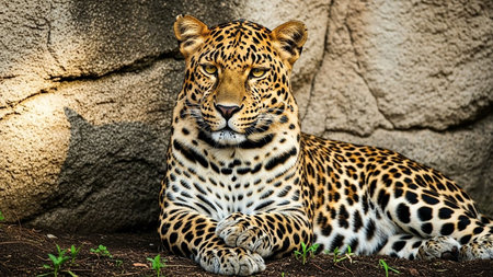 Majestic leopard resting on a rock, exuding power and grace, captivating with its intense stare