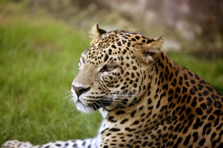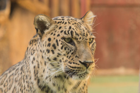 Leopard head shot with brown and green background at madrid zoo in spain