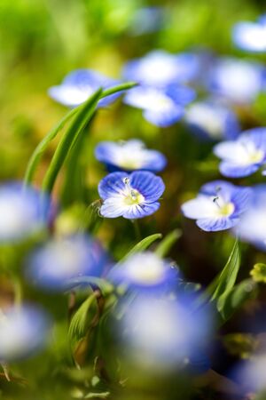 Little spring blue Veronica flowers bloom outdoors on the lawn