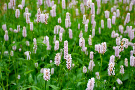 Semi-evergreen plant Red bistort (Persicaria bistorta) 'Superbum' with dense spikes of small light pink flowers in summer with blurred green background. Floral scenery