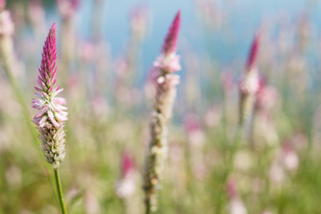 Beautiful fairy dreamy magic pink purple celosia argentea flower on green background. Dark art moody floral. Natural floral backdrop wallpaper. Toned with filters in retro vintage style.