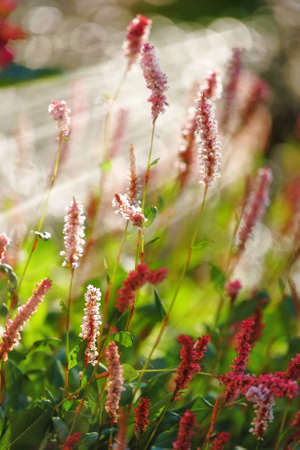 Flowering flames of the knotweed Persicaria amplexicaulis firetail in the morning light. Wild Cottage garden in the morning sun blurrred background macro, south burgenland