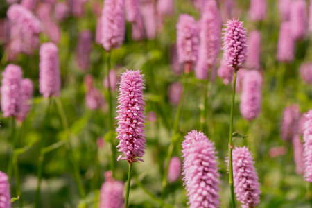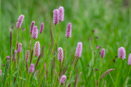 Bistorta officinalis meadow european bistort in bloom, pink meadow flowering snakeroot snakeweed plants in green grassland