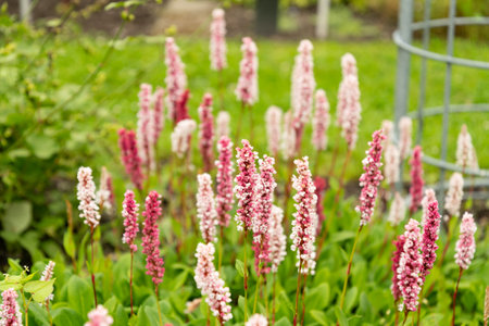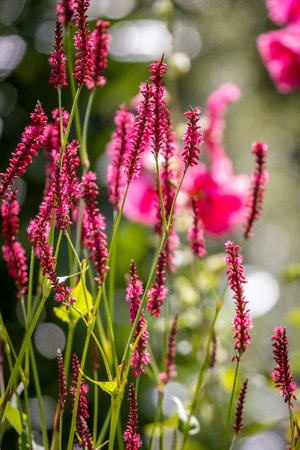 Pretty flower spikes of Persicaria amplexicaulis in a garden with soft focus
