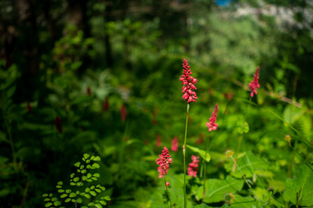 Bistorta amplexicaulis, also known as red bistort or mountain fleece, with red flowers blooming in the Himalayan meadows of Himachal Pradesh, India.
