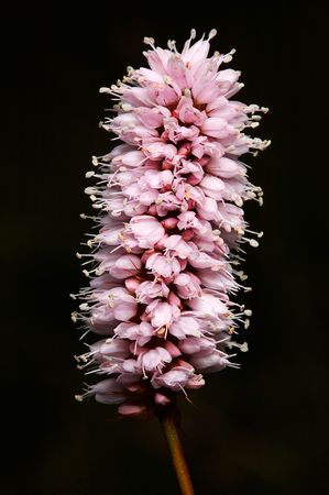 European Bistort or snakeweed, Bistorta officinalis, pink flowers with dark bokeh background.