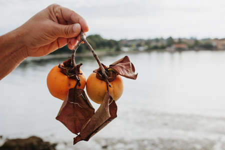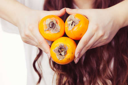 Female hand holding persimmon kaki fruits. Healthy eating, aid in weight loss, improve digestion.