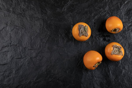 Four ripe persimmon fruit placed on black surface