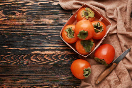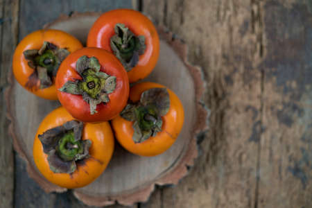 Ripe persimmon fruit on a wooden background. Top view.