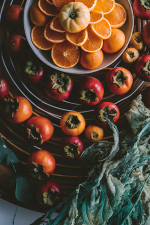 top view persimmons cut oranges