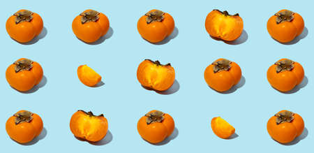 Colorful fruit pattern of fresh whole and sliced organic persimmon fruit with leaves on blue background. Healthy eating and food concept. Flat lay, top view. Design element