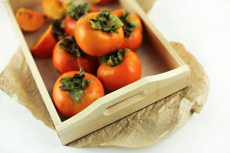 Persimmons close-up lying in a wooden box on a white background. Organic farming, healthy food concept, eco-friendly products, vegetarian, raw products