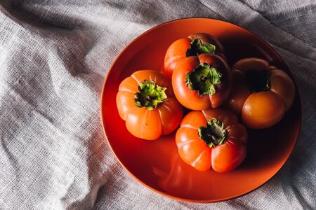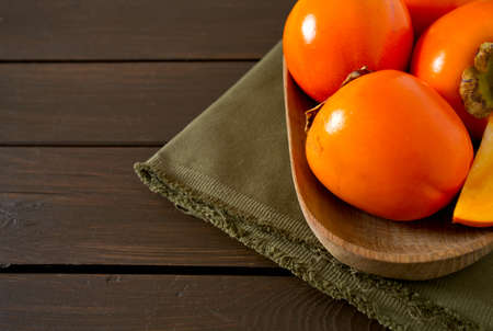Top view of persimmons with cloth on a wooden table with copy space for text. Concept of health fruit.