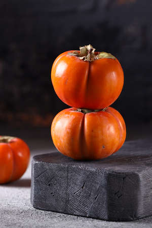 Ripe fresh persimmon on wood board. Food ingredient. Fruits