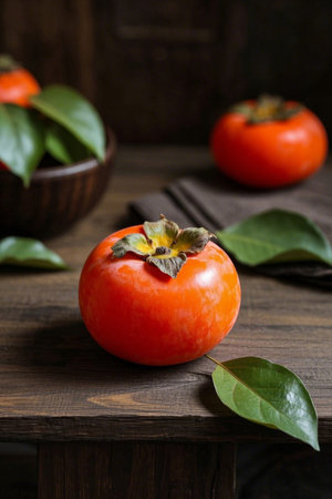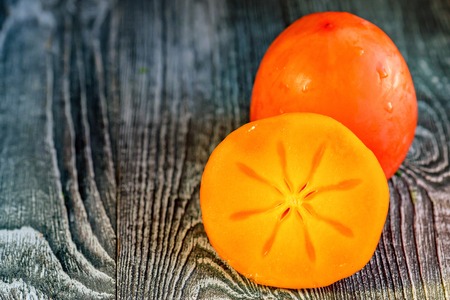 Fresh persimmon on a vintage wooden table