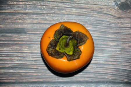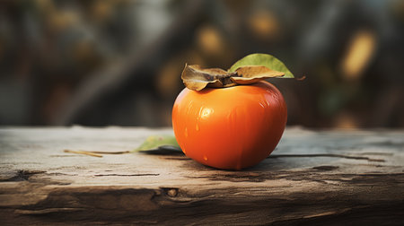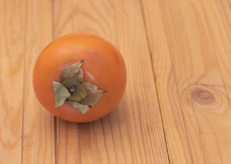 A persimmon fruit on a wooden background - benefits concept