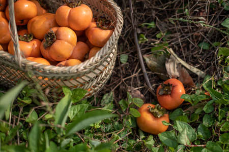 The red persimmons in the basket on the grass