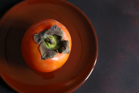 One ripe persimmon in a plate isolated on a brown background. Diospyros kaki. Healthy autumn fruit. Overhead view. Copy space.