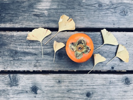 ripe orange persimmon and six yellow ginkgo leaves on wooden bench with copy space on left side of frame, shoot from top view, “winter is coming†concept