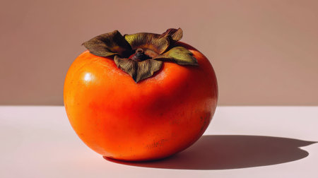 A striking persimmon showcases its vibrant orange hue and green leaves, beautifully arranged against a soft neutral backdrop, capturing nature's bounty.